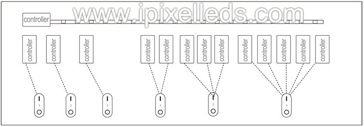 您可以通过将灯光链接到不同的区域来向 4 通道遥控器上的区域添加无限数量的灯光。这样您就可以完全灵活地创建不同的组组合。 下面您可以看到一些分组示例。